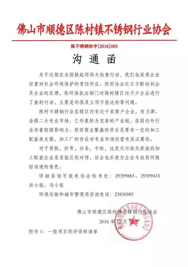 而就在本周初(12月12日),陳村鎮(zhèn)不銹鋼行業(yè)協(xié)會(huì)發(fā)溝通函,就金錩、力源兩大市場(chǎng)剪板、折彎、分條、平板等無(wú)污染無(wú)排放的加工配套企業(yè)與政府溝通,望能區(qū)別對(duì)待。