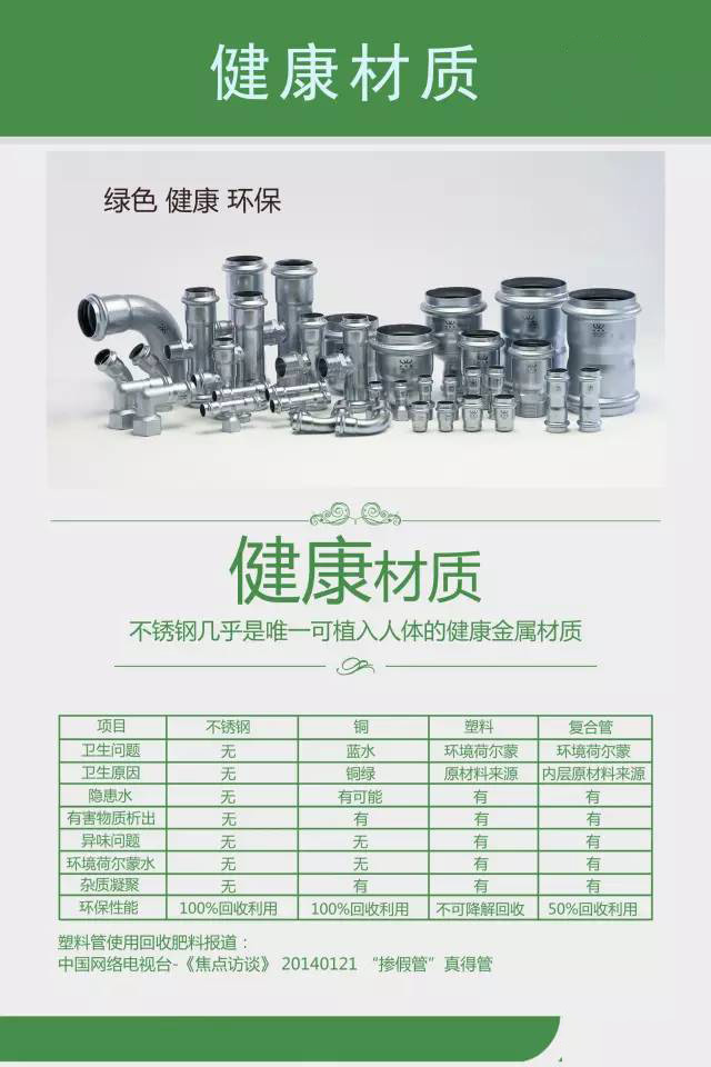 在這樣的大背景下,不銹鋼管材以其幾乎為零的漏水率和無與倫比的健康性被推上了城市供水系統(tǒng)和建筑物水管領(lǐng)域。研究并實際表明,一旦不銹鋼管材被廣泛運(yùn)用,城市管網(wǎng)的漏水率將大幅度降低,建筑物水質(zhì)將得到充分保障。薄壁不銹鋼管材以其所特有的安全性、可靠性、清潔性、耐用性、經(jīng)濟(jì)性和環(huán)保性等各方面突出優(yōu)勢,為保護(hù)水資源、改善水質(zhì)、保護(hù)人們的健康和提高生活質(zhì)量,保護(hù)人們的健康的提高生活質(zhì)量,保護(hù)環(huán)境和促進(jìn)社會經(jīng)濟(jì)的可持續(xù)發(fā)展發(fā)揮關(guān)鍵作用。